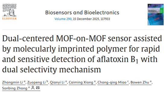 我校理学院化学系张三兵副教授团队在检验检测领域国际顶级期刊《生物传感器和生物电子学》(Biosensors and Bioelectronics)发表了题为《基于分子印迹聚合物辅助的双中心MOF-on-MOF传感器对黄曲霉毒素B1的快速和高灵敏检测及其双选择性机制》“Dual-centered MOF-on-MOF sensor assisted by molecularly imprinted